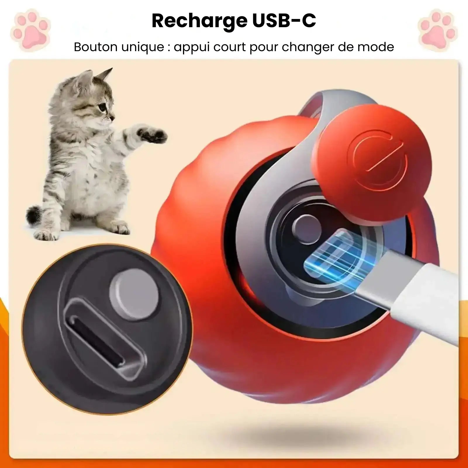 Le jouet se recharge facilement à l’aide d’un câble USB-C (inclus) via un port USB standard ou un adaptateur secteur compatible.